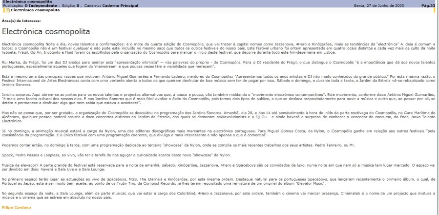 Electrónica cosmopolita Junho 27, 2003Agosto 29, 2011Add a comment Noite e dia, novos talentos e confirmações: é o mote da quarta edição do Cosmopólis, que vai trazer à capital nomes como Jazzanova, 4Hero e Rinôçerose, mais as tendências da electrónica… in: O Independente, 27 Junho 2003 Partilhar: Partilhar no Facebook (Abre numa nova janela) Facebook Share on X (Abre numa nova janela) X Share on WhatsApp (Abre numa nova janela) WhatsApp Email a link to a friend (Abre numa nova janela) E-mail Imprimir (Abre numa nova janela) Imprimir Gosto Carregando... Relacionado