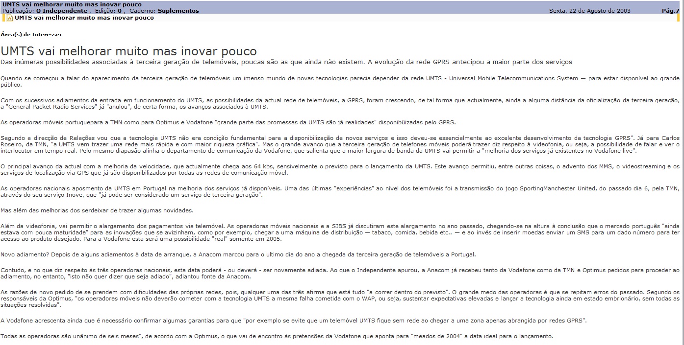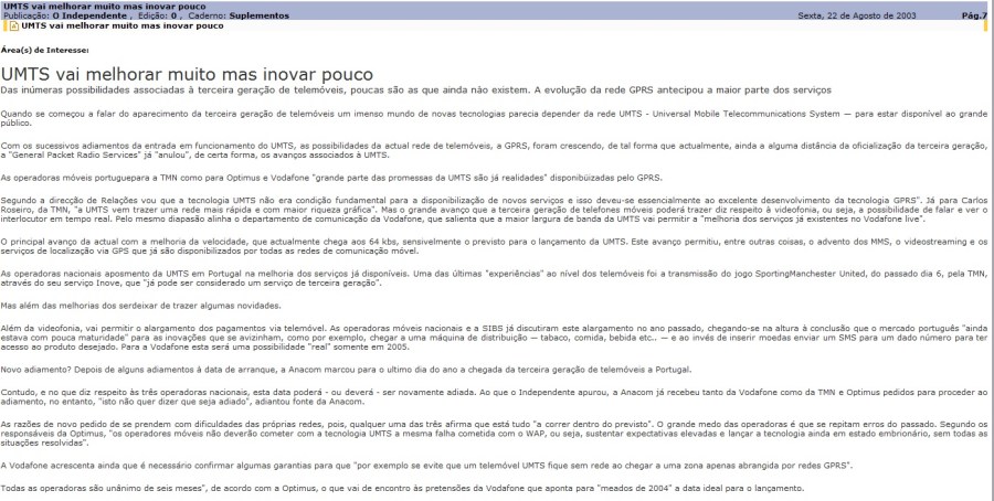 UMTS vai melhorar muito mas inovar pouco Agosto 22, 2003Agosto 28, 2011Add a comment Partilhar: Partilhar no Facebook (Abre numa nova janela) Facebook Share on X (Abre numa nova janela) X Share on WhatsApp (Abre numa nova janela) WhatsApp Email a link to a friend (Abre numa nova janela) E-mail Imprimir (Abre numa nova janela) Imprimir Gosto Carregando... Relacionado