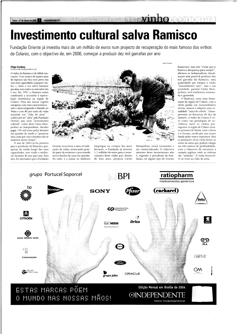 Investimento cultural salva Ramisco Agosto 28, 2004Agosto 15, 2015Add a comment in: O Independente, 27 Agosto 2004 Partilhar: Partilhar no Facebook (Abre numa nova janela) Facebook Share on X (Abre numa nova janela) X Share on WhatsApp (Abre numa nova janela) WhatsApp Email a link to a friend (Abre numa nova janela) E-mail Imprimir (Abre numa nova janela) Imprimir Gosto Carregando... Relacionado