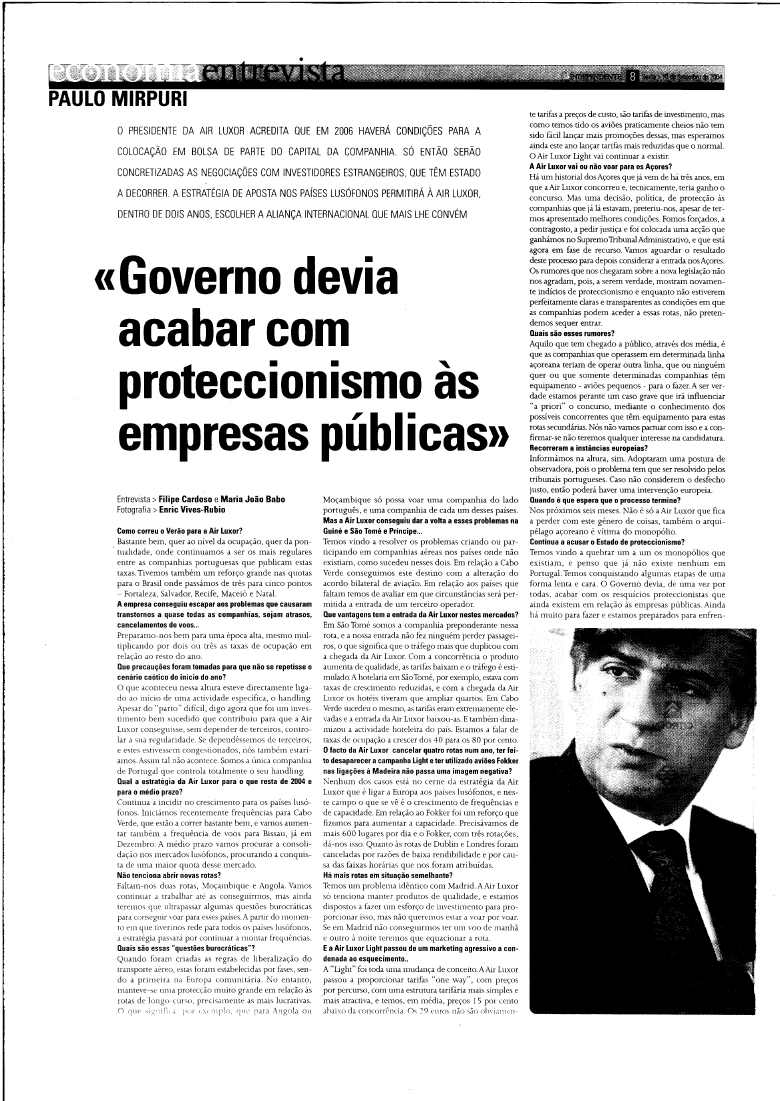 O presidente da Air Luxor acredita que em 2006 haverá condições para a colocação em bolsa de parte do capital da companhia. Só então serão concretizadas as negociações com investidores estrangeiros, que têm estado a decorrer. A estratégia de aposta nos países lusófonos permitirá à Air Luxor, dentro de dois anos, escolher a aliança internacional que mais lhe convém…