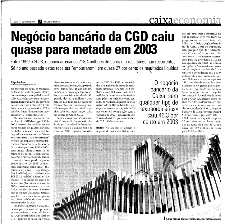 Negócio bancário da CGD caiu quase para metade em 2003 Outubro 1, 2004Agosto 30, 2011Add a comment Entre 1999 e 2003 o banco arrecadou 718,4 milhões de euros em resultados não recorrentes. Só no ano passado estas receitas empurraram em quase 27% os resultados líquidos… in: O Independente, 1 Outubro 2004 Partilhar: Partilhar no Facebook (Abre numa nova janela) Facebook Share on X (Abre numa nova janela) X Share on WhatsApp (Abre numa nova janela) WhatsApp Email a link to a friend (Abre numa nova janela) E-mail Imprimir (Abre numa nova janela) Imprimir Gosto Carregando... Relacionado