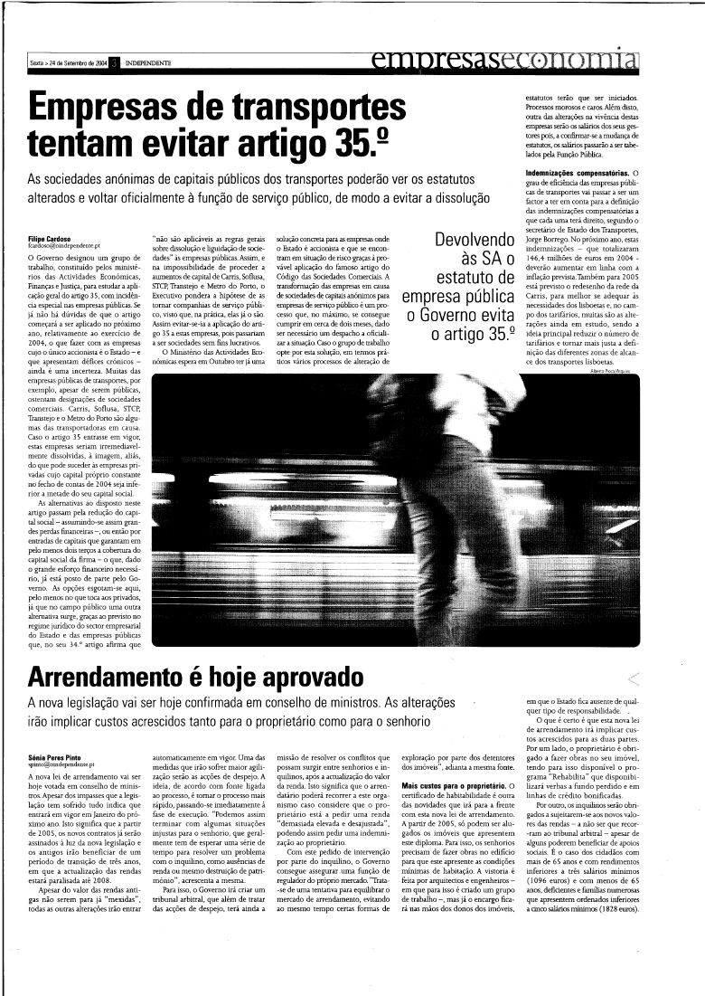 Empresas de transportes tentam evitar artigo 35º Outubro 2, 2004Agosto 28, 2011Add a comment As sociedades anónimas de capitais públicos dos transportes poderão ver os estatutos alterados e voltar oficialmente à função de serviço público, de modo a evitar a dissolução… in: O Independente, 1 Outubro 2004 Partilhar: Partilhar no Facebook (Abre numa nova janela) Facebook Share on X (Abre numa nova janela) X Share on WhatsApp (Abre numa nova janela) WhatsApp Email a link to a friend (Abre numa nova janela) E-mail Imprimir (Abre numa nova janela) Imprimir Gosto Carregando... Relacionado