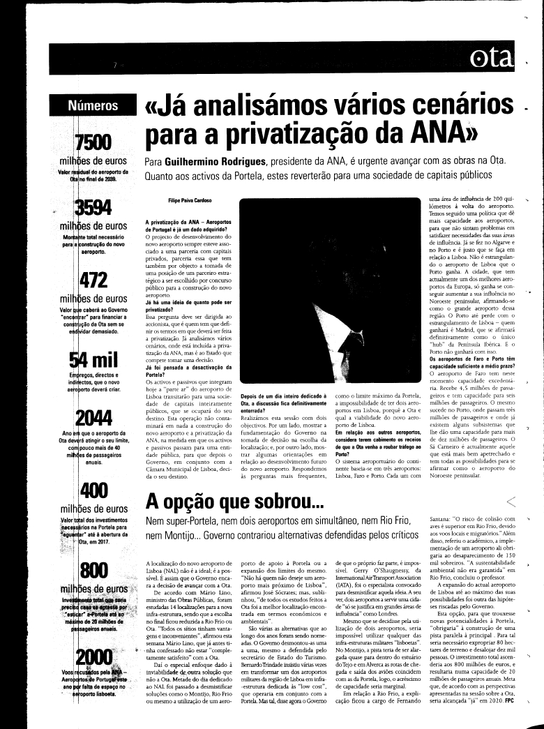 Guilermino Rodrigues: “Já analisámos vários cenários para a privatização da ANA” Novembro 30, 2004Agosto 30, 2011Add a comment Para Guilhermino Rodrigues, presidente da ANA, é urgente avançar com as obras na Ota. Quanto aos activos da Portela, estes reverterão para uma sociedade de capitais públicos… in: O Independente, Novembro 2004 Partilhar: Partilhar no Facebook (Abre numa nova janela) Facebook Share on X (Abre numa nova janela) X Share on WhatsApp (Abre numa nova janela) WhatsApp Email a link to a friend (Abre numa nova janela) E-mail Imprimir (Abre numa nova janela) Imprimir Gosto Carregando... Relacionado