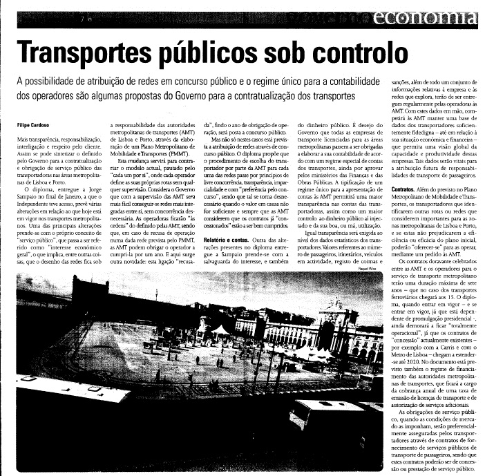 Transportes públicos sob controlo Fevereiro 4, 2005Agosto 30, 2011Add a comment A possibilidade de atribuição de redes em concurso público e o regime único para a contablidade dos operadores são algumas propostas do Governo para a contratualização dos transportes… in: O Independente, 4 Fevereiro 2005 Partilhar: Partilhar no Facebook (Abre numa nova janela) Facebook Share on X (Abre numa nova janela) X Share on WhatsApp (Abre numa nova janela) WhatsApp Email a link to a friend (Abre numa nova janela) E-mail Imprimir (Abre numa nova janela) Imprimir Gosto Carregando... Relacionado