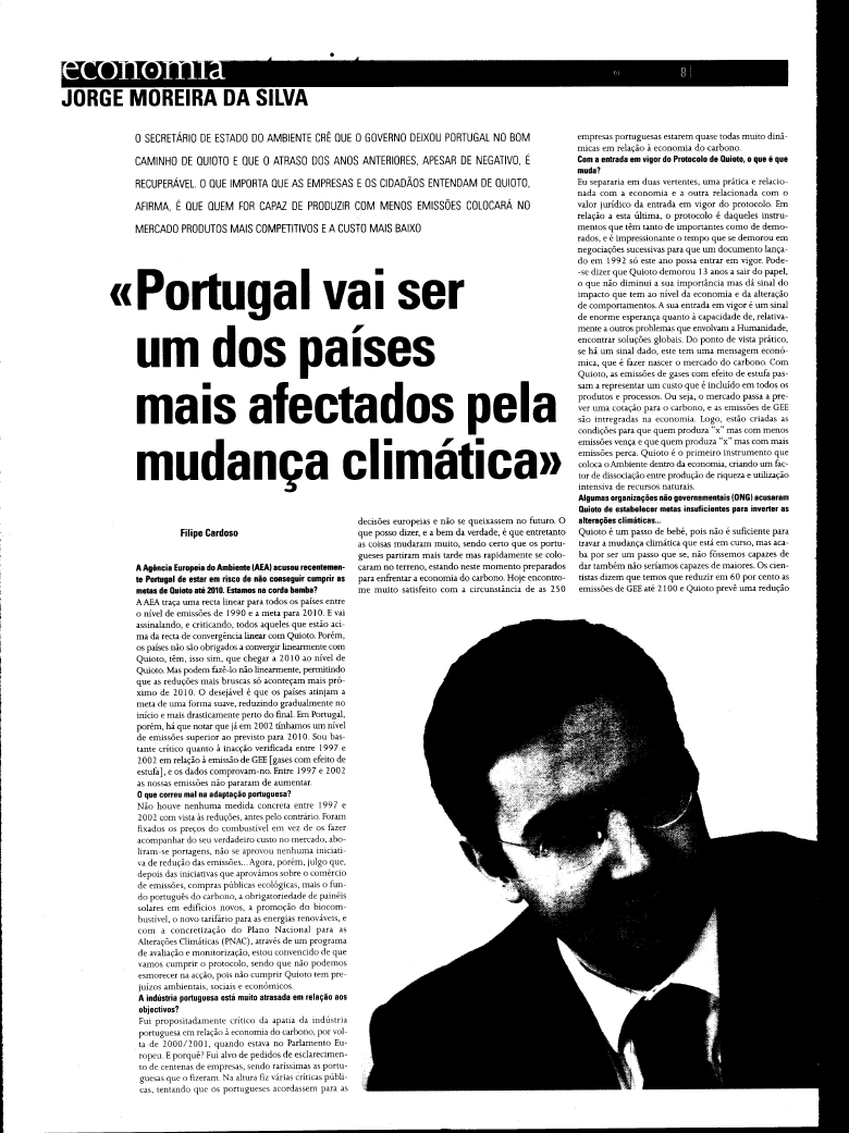 Jorge Moreira da Silva: “Portugal vai ser um dos países mais afectados pela mudança climática” Fevereiro 18, 2005Agosto 30, 2011Add a comment O secretário de Estado do Ambiente crê que o Governo deixou Portugal no bom caminho de Quioto e que o atrado de anos anteriores, apesar de negativo, é recuperável… in: O Independente, 18 Fevereiro 2005 Partilhar: Partilhar no Facebook (Abre numa nova janela) Facebook Share on X (Abre numa nova janela) X Share on WhatsApp (Abre numa nova janela) WhatsApp Email a link to a friend (Abre numa nova janela) E-mail Imprimir (Abre numa nova janela) Imprimir Gosto Carregando... Relacionado