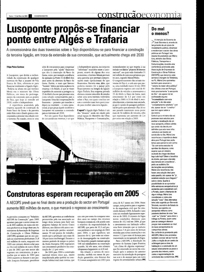 Lusoponte propôs-se financiar ponte entre Algés e Trafaria Maio 13, 2005Agosto 17, 2015Add a comment A concessionária das duas travessias sobre o Tejo disponibilizou-se para financiar a construção da terceira ligação, em troca da extensão da sua concessão, que actualmente chega até 2030… in: O Independente, 13 Maio 2005 Partilhar: Clique para partilhar no Facebook (Abre numa nova janela) Facebook Click to share on X (Abre numa nova janela) X Clique para partilhar no WhatsApp (Abre numa nova janela) WhatsApp Carregue aqui para enviar por email a um amigo (Abre numa nova janela) E-mail Carregue aqui para imprimir (Abre numa nova janela) Imprimir Gosto Carregando... Relacionado