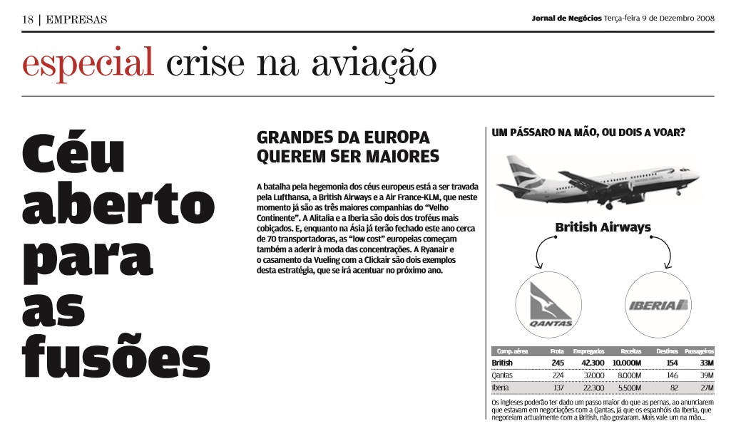 Não há dinheiro, não há viagens. As companhias aéreas deverão apresentar este ano prejuízos recorde, e as previsões para 2009 pintam o céu de cores ainda mais escuras. Uma das formas de combater este cenário passa pela aceleração dos processos de fusão e aquisição, nos quais British Airways, Lufthansa e Air France/KLM estão empenhadas (ver infografia). Outro cenário que se afigura provável, e à imagem do que outros têm feito, é este sector– de fabricantes a companhias – avançar com pedidos de ajudas do Estado, aproveitando o precedente aberto pela excepção concedida à indústria automóvel. Apesar da ideia estar a ganhar adeptos, por enquanto não passa disso, de uma ideia. Para já, o presidente executivo da IATA (Associação Internacional do Transporte Aéreo), Giovanni Bisignani, revela hoje em Genebra,Suíça, as dificuldades que a indústria viverá no próximo ano.