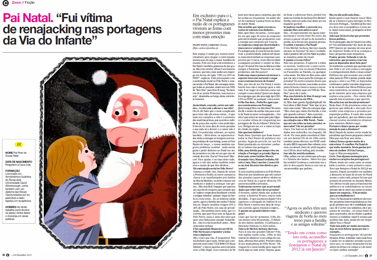 Este espaço é usado por muitos entrevistadores para elogiar o entrevistado, mesmo que ele seja o maior bandido do mundo. Pois nós hoje entrevistámos o Pai Natal e também gostamos de dar graxa. Mas este senhor afinal é um homem comum que tem como sonho um emprego em forma de sigla: “CEO ou CFO ou FEEF”, explicou. Está preocupado com a contestação social no Pólo Norte e, mesmo sendo o Pai Natal, não consegue entregar todas as prendas: ainda tem um VHS do “Ben-Hur” para Kim Il-sung. “Eu bem vou lá ao monte Pókemon, mas nunca o vejo”, desabafou ao longo desta entrevista honesta.