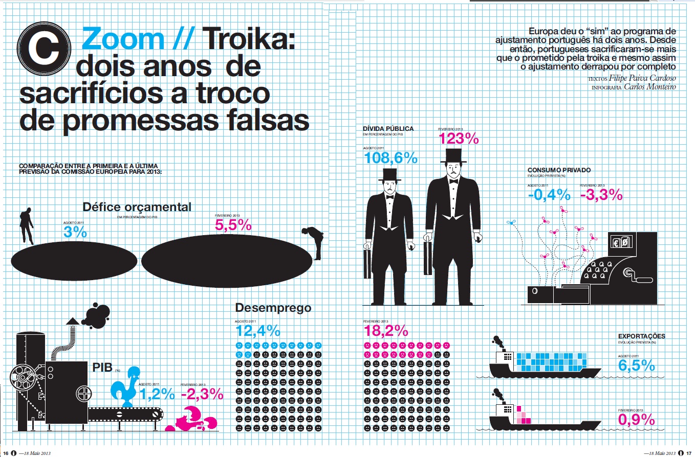 Exportações Era o trunfo na manga. A teoria para a recuperação portuguesa apostava em duas vias:esmagamento do rendimento para reduzir as importações e fazer explodir as exportações. A parte fácil até foi feita, com cortes salariais e o custo de vida a aumentar de tal forma que os portugueses deixaram de consumir. Agora, o difícil continua por fazer:o programa assenta a recuperação económica do país à boleia do crescimento das exportações, que deveria ser de 5,9% em 2012 e mais 6,5% este ano. Os números mais recentes mostram, contudo, que as exportações só irão crescer 3,3% e 0,9%, em 2012 e 2013.