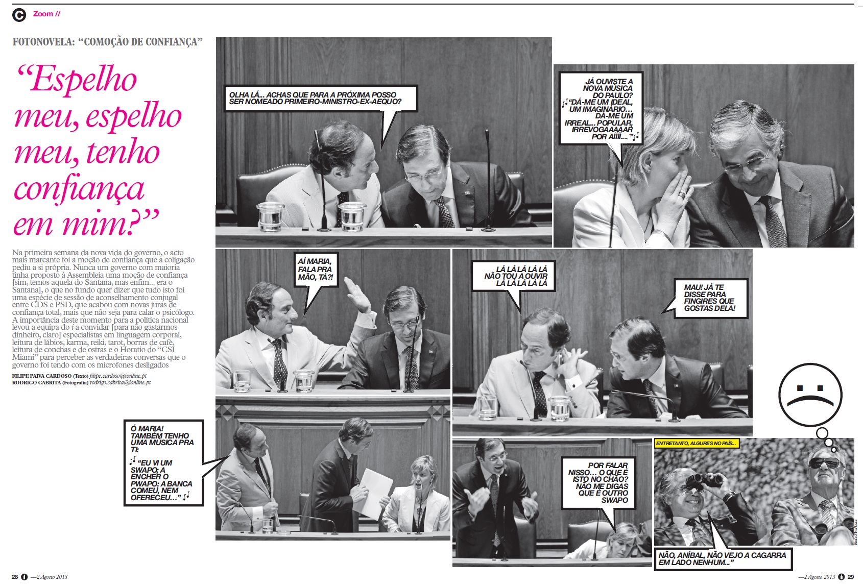 Na primeira semana da nova vida do governo, o acto mais marcante foi a moção de confiança que a coligação pediu a si própria. Nunca um governo com maioria tinha proposto à Assembleia uma moção de confiança [sim, temos aquela do Santana, mas enfim… era o Santana], o que no fundo quer dizer que tudo isto foi uma espécie de sessão de aconselhamento conjugal entre CDS e PSD, que acabou com novas juras de confiança total, mais que não seja para calar o psicológo. A importância deste momento para a política nacional levou a equipa do i a convidar [para não gastarmos dinheiro, claro] especialistas em linguagem corporal, leitura de lábios, karma, reiki, tarot, borras de café, leitura de conchas e de ostras e o Horatio do “CSI Miami” para perceber as verdadeiras conversas que o governo foi tendo que o governo foi tendo com os microfones desligados.