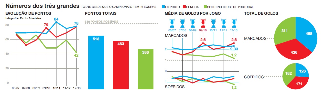 Mais sete pontos em média por época, mais 32 golos marcados, menos 45 golos sofridos. É isto que separa o Futebol Clube do Porto do Sport Lisboa e Benfica. Já os encarnados fazem mais 11 pontos em média por época, mais 125 golos marcados e menos 11 golos sofridos. É isto que separa o Benfica do Sporting Clube de Portugal. Das diferenças entre Porto e Sporting nem vale a pena falar. A análise estatística ao que aconteceu no futebol português desde 2006/7 – quando passou a 16 clubes e 30 jogos – deixa evidente o porquê do domínio do FCP.