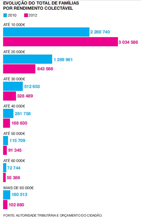 Segundo dados da Autoridade Tributária e do Orçamento do Cidadão (OC), esta semana divulgado, em 2010 foram entregues 4,71 milhões de declarações de rendimento em Portugal. Deste total, 48,4% declaravam menos de 10 mil euros brutos e 51,6% mais que aquele valor anual bruto. Mas em apenas dois anos a mudança foi radical: segundo os dados avançados no OC, as declarações de rendimentos de 2012, entregues em 2013, mostram que 3,04 milhões de famílias ganharam menos de 10 mil euros brutos, uma subida de 33% ou mais 753 mil agregados – isto quando em 2010 os portugueses já ganhavam o equivalente a 50% da média da UE.