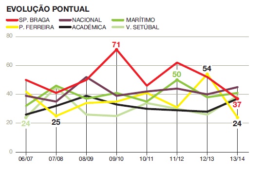 Entre estes seis clubes, apenas um conseguiu fechar este ciclo no futebol português com mais de 50% dos pontos possíveis: o Sp. Braga, que nas últimas oito épocas acumulou um total de 409 pontos, 56,8% dos que estiveram em disputa desde 2006/07 – compara com os 62,9% do SCP, 74,6% do SLB e 80,6% do FCP. O Sp. Braga viveu em 2013/14 a sua pior época das últimas oito temporadas, sendo preciso recuar a 2007/08 para ver os bracarenses com uma pontuação próxima dos 37 pontos deste ano, tendo fechado então o campeonato com 41 pontos.