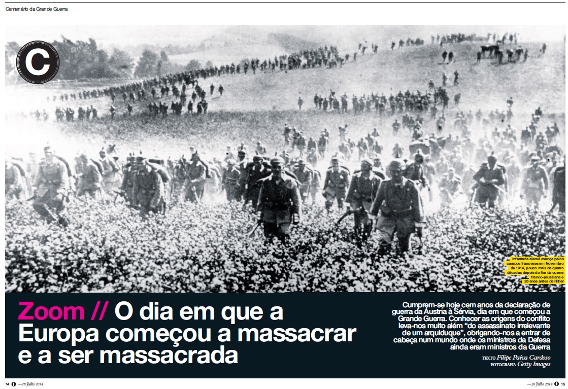 Gavrilo Princip assassinou o herdeiro austríaco quando este visitava Sarajevo a 28 de Junho de 2014. Um mês depois, faz hoje cem anos, a Áustria declarou guerra à Sérvia e a primeira peça do dominó caiu. Seguiram-se todas as outras: os alemães desta vez decidiram não recuar e ofereceram apoio total aos austríacos, levando a Rússia a avançar para a mobilização geral a 29 de Julho. Uma semana depois já a Europa estava quase toda em guerra, ou, como sintetizou o “The Onion”, jornal satírico,”a Áustria declarou guerra à Sérvia, que declarou guerra à Alemanha, que declarou guerra à França que declarou guerra à Turquia que declarou guerra à Rússia que declarou guerra à Bulgária que declarou guerra à Grã-Bretanha.” A Europa assinava a sua nota de suicídio.