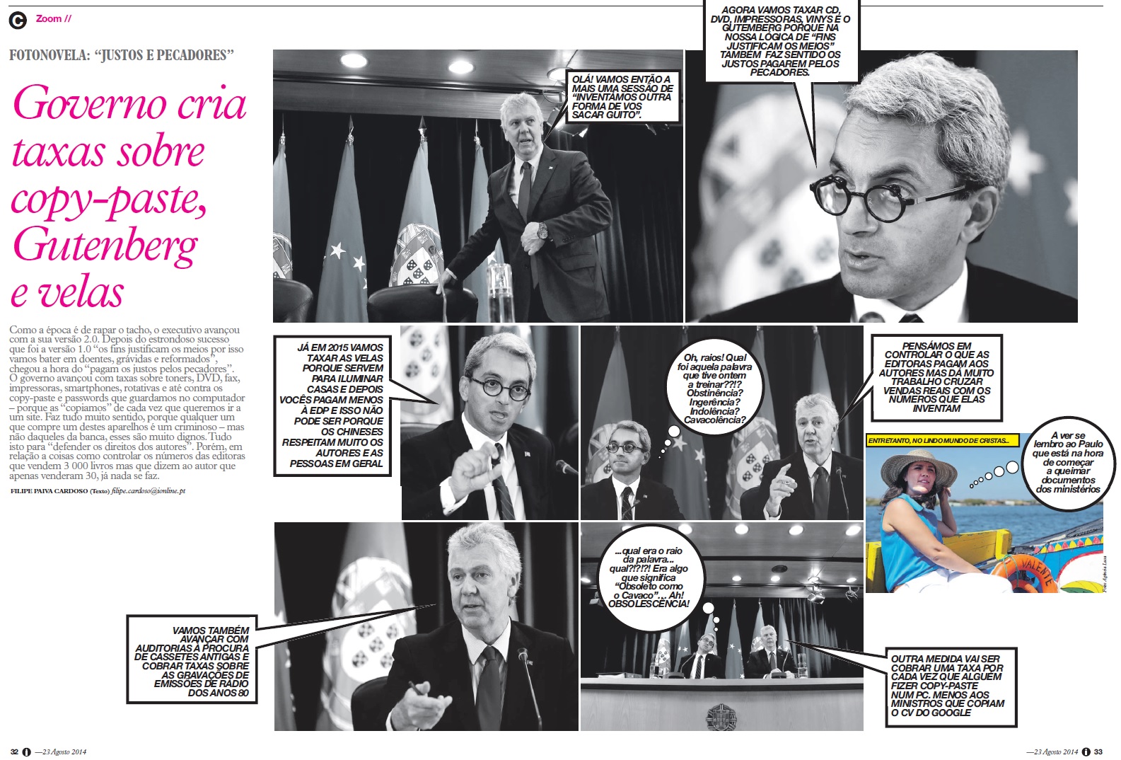 Como a época é de rapar o tacho, o executivo avançou com a sua versão 2.0. Depois do estrondoso sucesso que foi a versão 1.0 “os fins justificam os meios por isso vamos bater em doentes, grávidas e reformados”, chegou a hora do “pagam os justos pelos pecadores”. O governo avançou com taxas sobre toners, DVD, fax, impressoras, smartphones, rotativas e até contra os copy-paste e passwords que guardamos no computador – porque as copiamos de cada vez que queremos ir a um site. Faz tudo muito sentido, porque qualquer um que compre um destes aparelhos é um criminoso – mas não daqueles da banca, esses são muito dignos. Tudo isto para “defender os direitos dos autores”. Porém, em relação a coisas como controlar os números das editoras que vendem 3 000 livros mas que dizem ao autor que apenas venderam 30, já nada se faz.