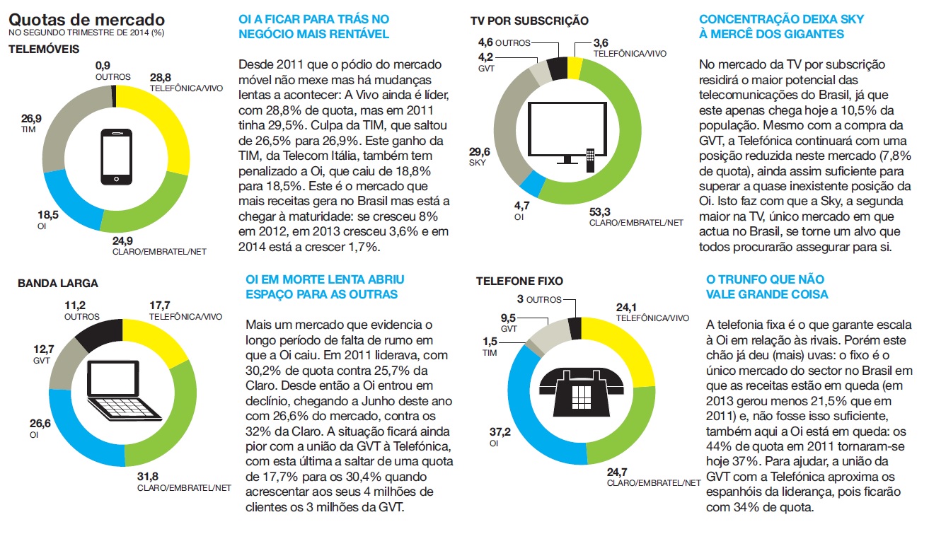 A guerra A aquisição da GVT, ainda à espera das aprovações oficiais, deverá custar à Telefónica 7,2 mil milhões de euros, devendo ser fechada em meados de 2015. A GVT, ainda detida pelos franceses da Vivendi, é uma operadora pequena perante a dimensão das telecomunicações brasileiras. A empresa está presente em três dos quatro principais mercados do sector – fixo, banda larga e TV por subscrição -, sendo a quarta maior em todos eles. O único mercado em que a GVT não está é o dos telemóveis, segmento em que a Telefónica já é líder, graças aos 79,4 milhões de clientes da Vivo.