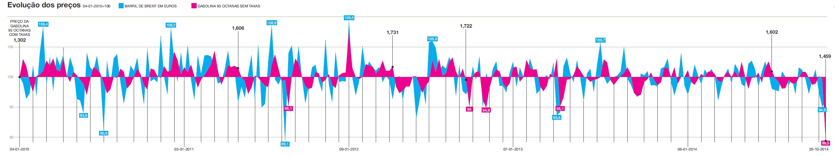 No gráfico ao lado está a evolução do preço do barril em euros e do litro de gasolina em Portugal antes de impostos de 2010-2014 – base 100 –, sendo a partir desta que se devem procurar desfasamentos demasiado prolongados – ou curtos – na subida ou descida da gasolina nos países do euro. De salientar, porém, que a Autoridade daConcorrência nunca conseguiu provar a existência de diferentes tempos para a subida e descida do litro:a AdC em mais de um relatório sobre o sector salienta que as “assimetrias [descidas vs. subidas] não têm expressão significativa”.