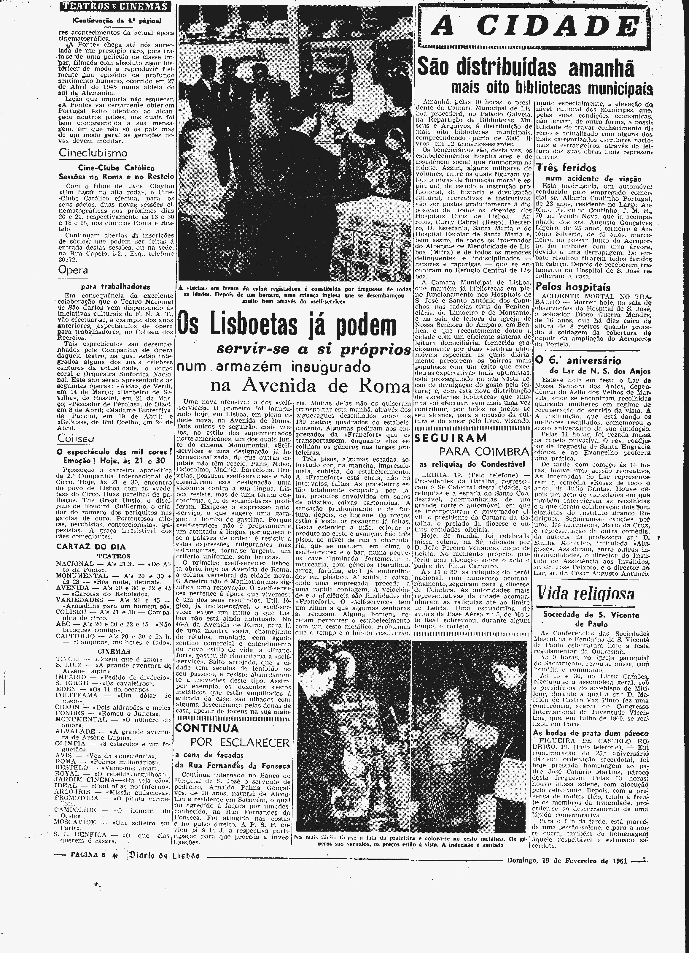 “Uma nova ofensiva: a dos ‘self-services’. O primeiro foi inaugurado hoje, em Lisboa, em plena cidade nova, na Avenida de Roma. Dois outros se seguirão, mais vastos, no estilo dos supermercados norte-americanos, um dos quais junto do cinema Monumental. ‘Self-service’ é uma designação já internacionalizada, de que outras capitais não têm receio. Paris. Milão, Estocolmo, Madrid, Barcelona, Bruxelas, possuem ‘self-services’ e não consideram esta designação contra a sua língua. Lisboa resiste, mas de uma forma descontínua, que os ‘snack-bars’ proliferam. Exige-se a expressão auto-serviço, o que sugere uma garagem, a bomba de gasolina. Porque ‘self-service’ não é propriamente um atentado à língua portuguesa e se a palavra de ordem é resistir a estas expressões fulgurantes mas estrangeiras, torna-se urgente um critério uniforme, sem brechas.”