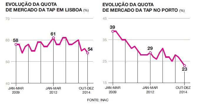 As quotas da TAP no aeroporto de Lisboa e do Porto chegaram a mínimos no último trimestre do ano passado, com os 54% obtidos pela transportadora em passageiros na Portela a encontrar paralelo apenas no terceiro trimestre de 2009, única ocasião em que descido a tal nível desde que o regulador da aviação português (INAC) começou a compilar dados sobre quotas trimestrais – início de 2009. Já no Porto a TAP conseguiu apenas 23% dos passageiros entre Outubro e Dezembro de 2014, valor nunca antes visto.