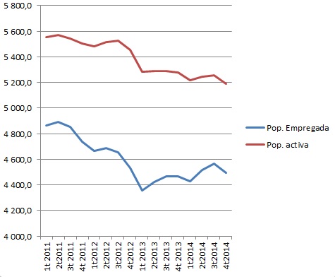 Até ao final do ano passado, o desemprego oficial recuou para os 13,5%, havendo 4,49 milhões de empregos registados e 698,3 mil desempregados. Ou seja, apesar da redução de 228,5 mil dos indivíduos desempregados entre Março de 2013 e Dezembro de 2014, no mesmo período a economia apenas criou 137 mil empregos, justificando assim apenas 60% da redução do total de desempregados contabilizados desde o pico do desemprego e até final de 2014.