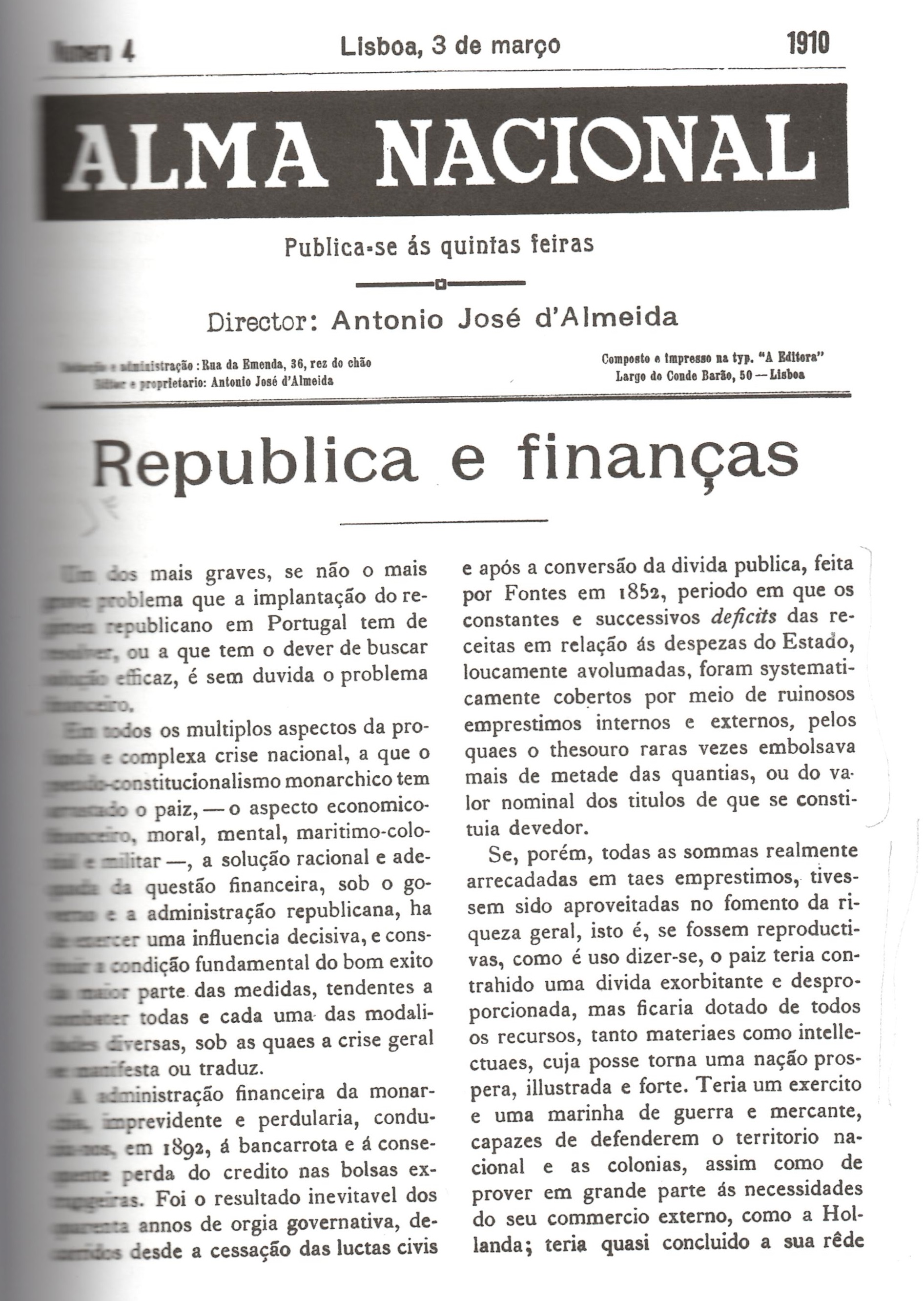 “(…) Examinando qualquer mappa da despeza orçamental dos ultimos annos economicos, vê-se desde logo que só o serviço da divida publica, sob as rubricas de Juros e amortisações a cargo do Thesouro, Encargos diversos e Divida Publica, absorve cerca de 30:000 contos, ou seja metade da receita total.”